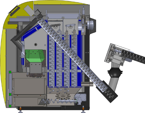 Komplett anschlussfertiger Heizkessel mit spezialgefertigtem, luftgekühlten Edelstahlbrenner, der über ein einfaches Klapprostsystem automatisch gereinigt wird. Auch der Mehrzugröhrenwärmetauscher besitzt eine automatische Reinigungsvorrichtung in Form speziell gefertigter Reinigungsturbolatoren. Die Verbrennungsregelung erfolgt mit Hilfe von Lambdasonde und Brennraumfühler sowie einer Mikroprozessorsteuerung. Dabei wird die Kesselleistung stufenlos dem aktuellen Wärmebedarf angepasst (modulierender Betrieb) und nur das von den Verbrauchern benötigte Temperaturniveau bereitgestellt (gleitende Arbeitsweise).