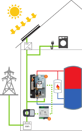 Die Leistungsmodulation sorgt dafür, dass schon kleinste Überschussleistungen von dem System genutzt werden. Außerdem wird über eine Leistungsmessung sicher gestellt, dass kein Netzstrom für Heizzwecke verwendet wird. Selbst geringe und schwankende Überschussleistungen können in nutzbare Wärme mit konstanter Temperatur umgewandelt werden. Damit wird der Speicher geschichtet von oben nach unten beladen und es steht nach kurzer Zeit bereits nutzbare Wärme zu Verfügung und die konventionelle, fossile Nachheizung wird unterdrückt.